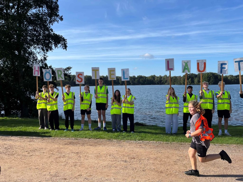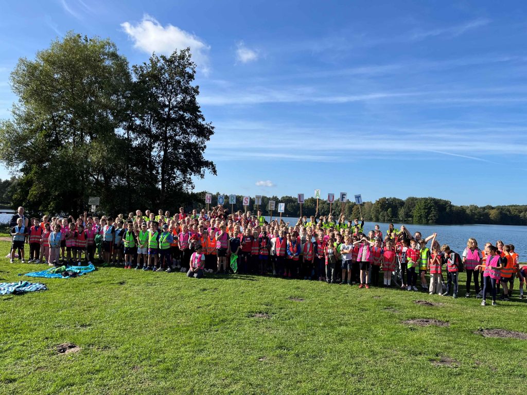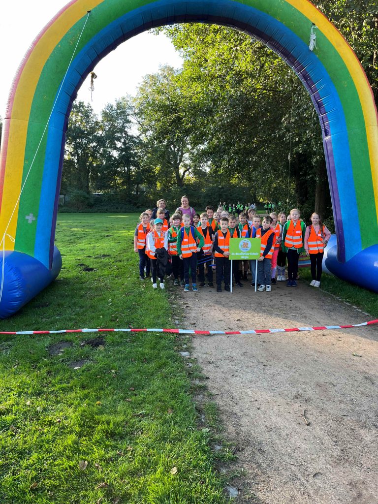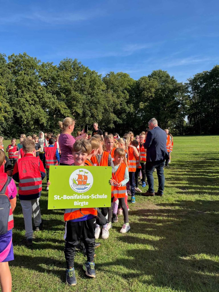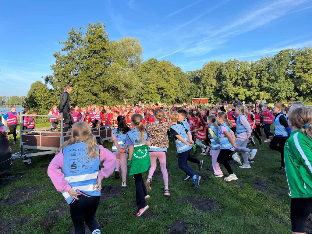 Am 19. September war es wieder soweit: Die Viertklässlerinnen und Viertklässler aller Grundschulen aus Hörstel traten zum gemeinsamen Lauf rund um den Torfmoorsee an. Und unsere Boni war natürlich auch dabei! Bei bestem Wetter fanden sich die Kinder in schulgemischten Gruppen zusammen und machten sich mit großer Vorfreude und auch ein bisschen Aufregung auf zur ersten Runde um den See. Begleitet wurden sie von Sporthelferinnen und Sporthelfern der Gesamtschule. Im Ziel wartete der Bürgermeister, Herr Ostholthoff, auf die Kinder und beglückwünschte jeden einzelnen zu der tollen Laufleistung. Bei vielen Kindern blieb es aber nicht nur bei einer Runde, sondern am Schluss konnten viele erzählen, dass sie sogar drei Runden geschafft hatten. Dabei stellte eine Runde eine besondere Herausforderung dar: Die Kinder bekamen zwei Minuten Vorsprung und der bekannte Läufer Patrick Windhoffer versuchte sie auf der Strecke noch einzuholen. Wieder zurück in der Schule erzählten die Kinder stolz von ihrer Laufleistung und präsentierten ihre Medaillen, die sie vom Bürgermeister überreicht bekamen.