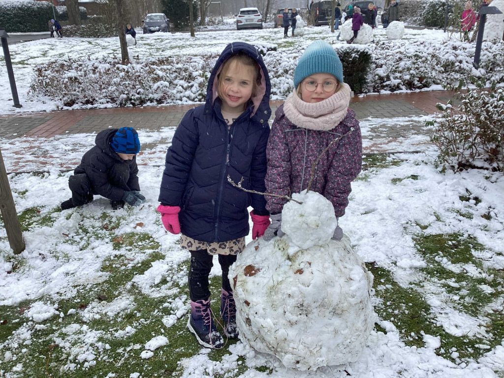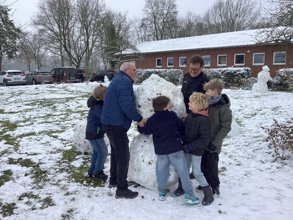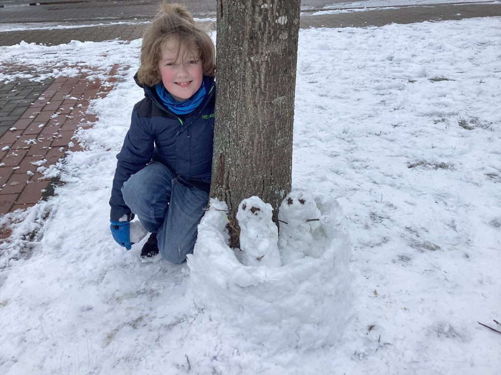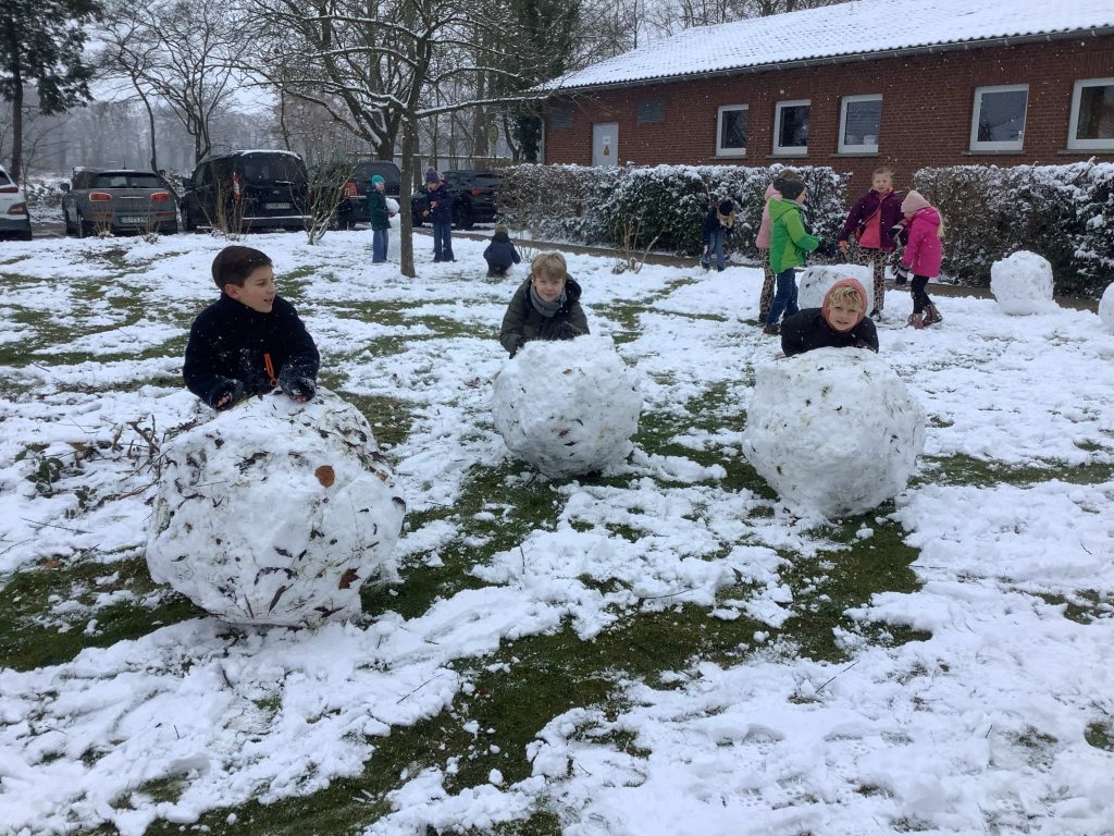 … kommt alle aus der Boni und baut die größten und schönsten Schneemänner! Das ließen sich die Kinder natürlich nicht zweimal sagen und verbrachten heute alle gemeinsam eine tolle Stunde im Schnee. Vor der Schule, auf dem Schulhof und auf dem Bolzplatz wurden Schneekugeln gerollt, zu kleinen und großen Schneefiguren zusammengesetzt und mit Stöckern und Steinen geschmückt. Es gab sogar bei einer ganz großen und schweren Kugel tatkräftige Unterstützung von unseren netten Busfahrern: mit vereinten Kräften entstand so ein riesiger Schneemann direkt an der Haltestelle!