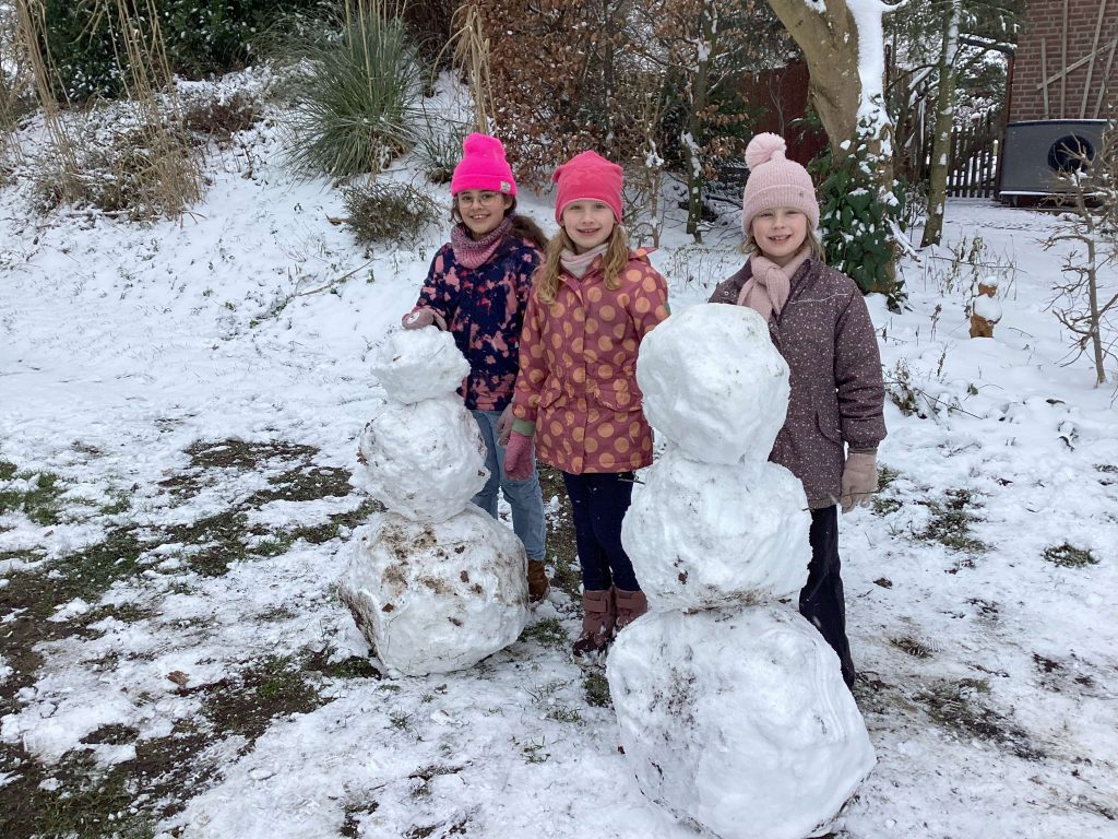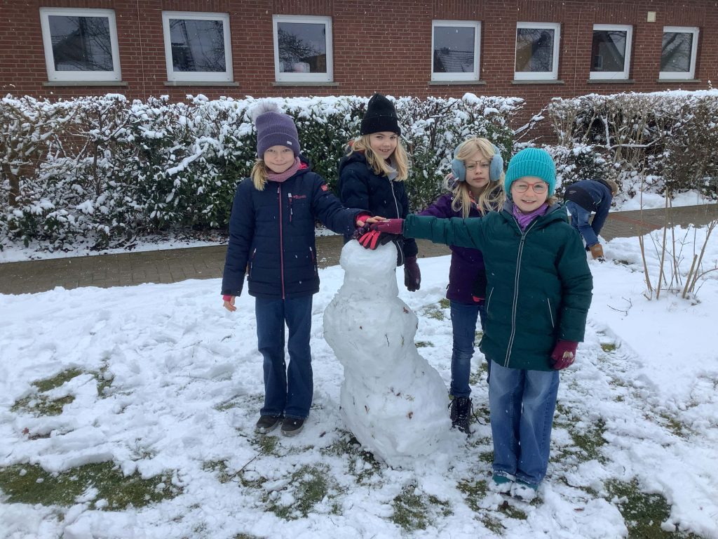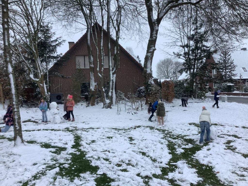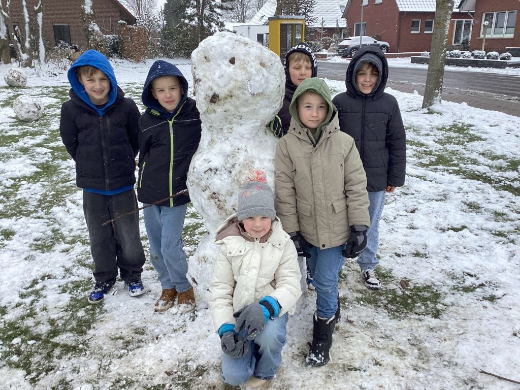 … kommt alle aus der Boni und baut die größten und schönsten Schneemänner! Das ließen sich die Kinder natürlich nicht zweimal sagen und verbrachten heute alle gemeinsam eine tolle Stunde im Schnee. Vor der Schule, auf dem Schulhof und auf dem Bolzplatz wurden Schneekugeln gerollt, zu kleinen und großen Schneefiguren zusammengesetzt und mit Stöckern und Steinen geschmückt. Es gab sogar bei einer ganz großen und schweren Kugel tatkräftige Unterstützung von unseren netten Busfahrern: mit vereinten Kräften entstand so ein riesiger Schneemann direkt an der Haltestelle!
